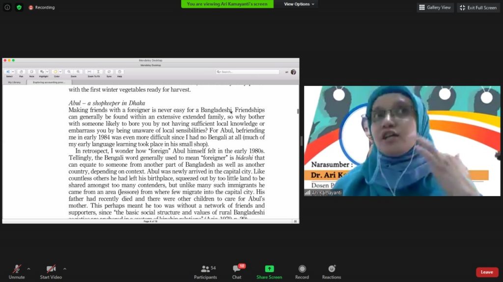 Setelah pembukaan, Dr. Ari Kamayanti menyampaikan materi kurang lebih 3 jam di selang dengan diskusi bersama 53 peserta yang tergabung.